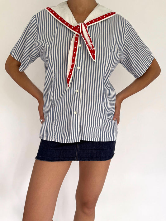 90s vintage striped nautical sailor collar button up blouse – small | novelty tie up front cotton shirt