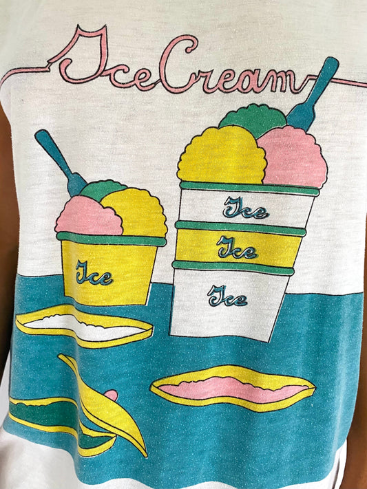 90s vintage white ice cream print sleeveless mini dress – small, medium | novelty cute retro long tshirt dress