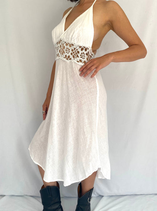 90s vintage white crochet sleeveless halter midi dress – small, medium | boho backless bridal festival beach cover up