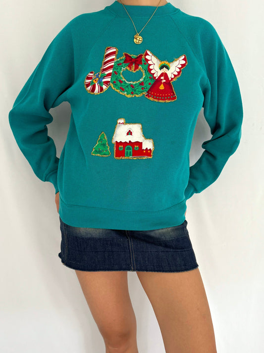 90s vintage turquoise holiday JOY pullover sweater – small | christmas season wreath angel glitter reworked raglan ugly sweatshirt