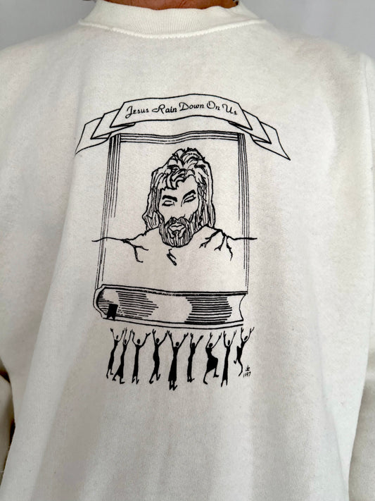 90s vintage white jesus religious graphic crewneck pullover sweater | unisex mens casual streetwear retro cozy cotton made in USA sweatshirt