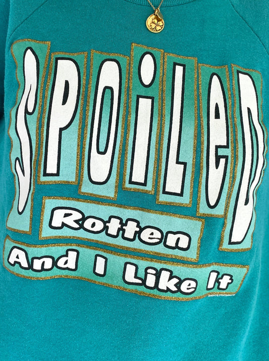 90s vintage turquoise spoiled rotten and I like it pullover sweater – medium | novelty tacky spellout glitter sweatshirt