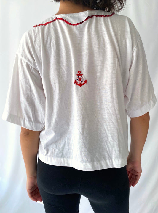90s vintage white nautical sailor cotton crop tee – small, medium | funky sailor sequins beaded half sleeve top