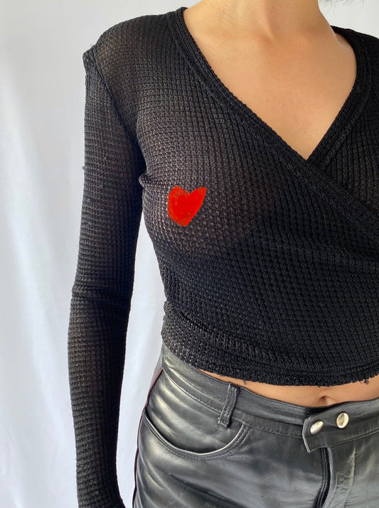 90s vintage versace jeans couture black knit crop shirt – small | long sleeved wrap plunge blouse