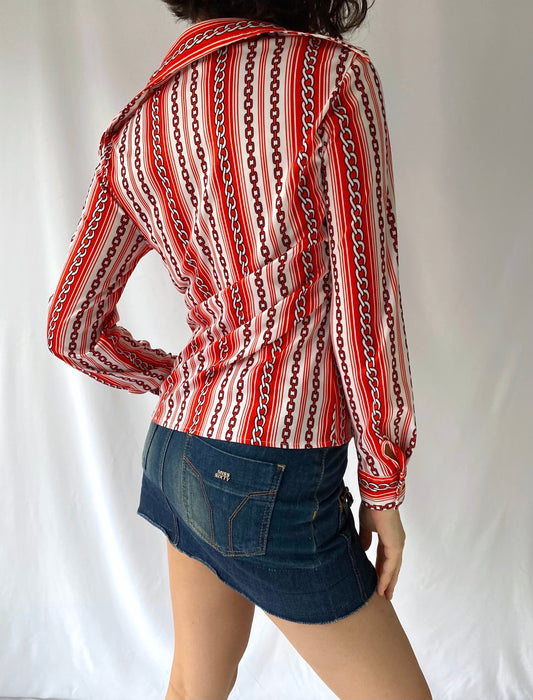 70s vintage red white chain link print long sleeved blouse – small, medium | retro mod collared button up shirt