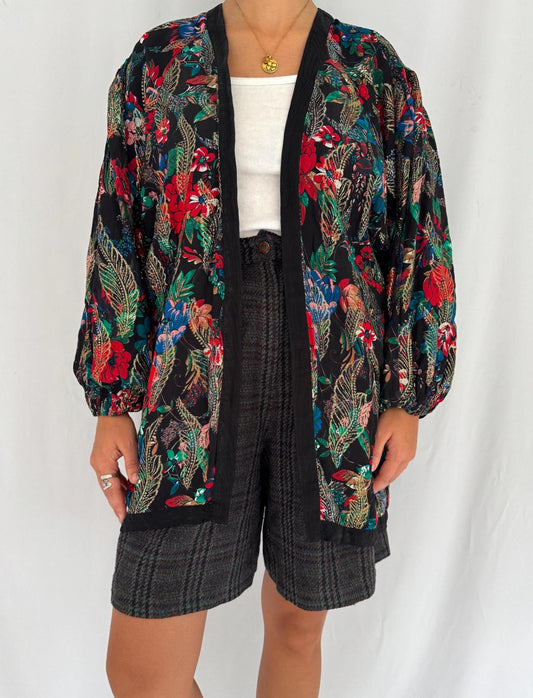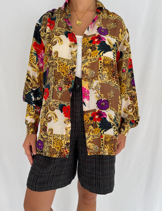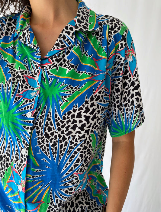 70s vintage tropical colorful short sleeved shirt – medium, large | rainbow floral leopard unisex vacation button up blouse