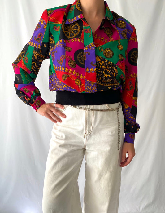 80s vintage colorful abstract cropped button up blouse – medium | rainbow retro bold printed long sleeved collared shirt