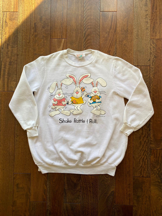 80s vintage cartoon bunnies shake rattle roll pullover sweatshirt – small, medium | graphic cotton unisex crewneck sweater