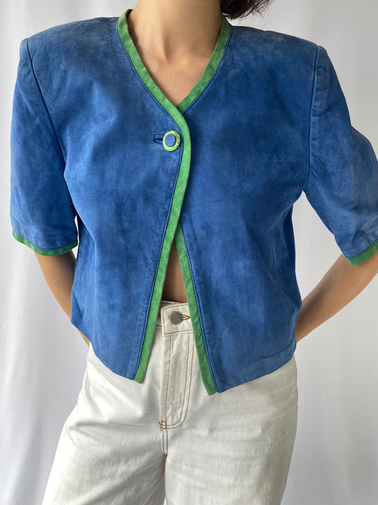 80s vintage blue green color block suede leather spring jacket – medium | danier casual pastel cropped button up blazer