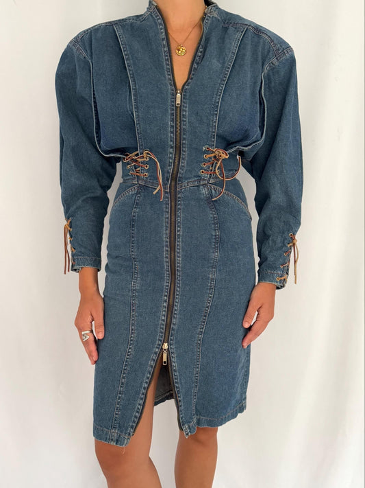80s vintage blue denim fitted pencil full zip up jean dress – small