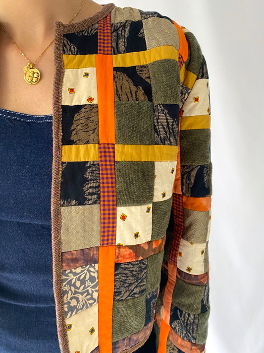 vintage brown orange quilted patchwork cropped jacket – medium, large | bohemian hippie artsy open front coat
