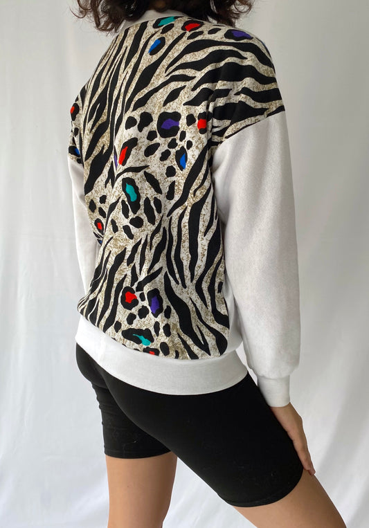 80s vintage rainbow tiger stripe leopard animal print pullover sweater – small | colorful handmade crewneck sweatshirt
