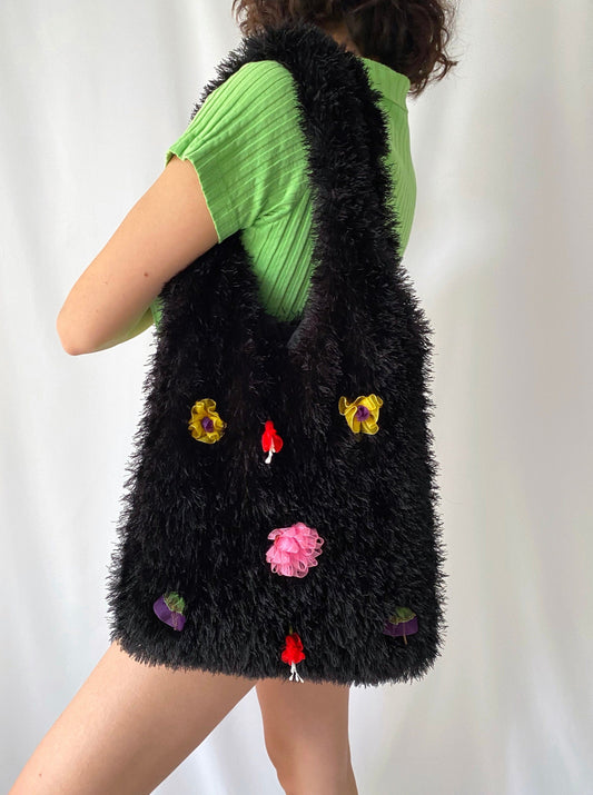 y2k vintage black plushy fluffy embellished floral large tote bag | unique cute oversized hobo shoulder purse