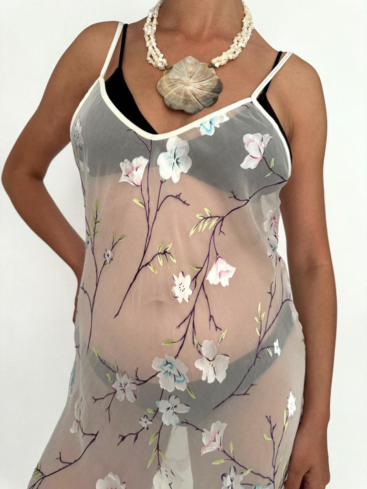 vintage cream floral embroidered lace trim sheer slip dress - medium