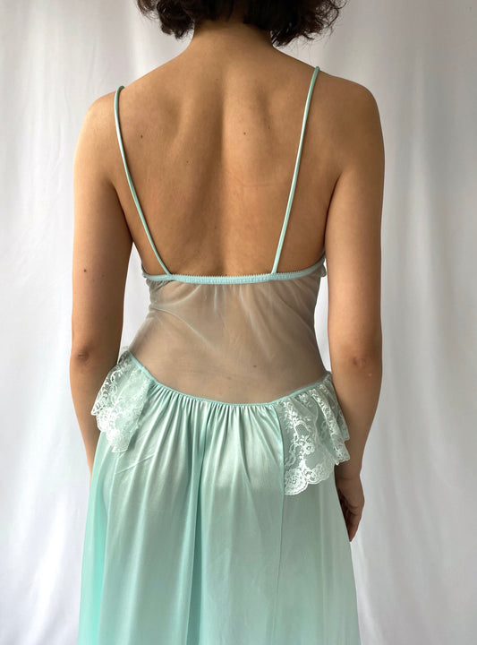 80s vintage aqua mint lace lingerie nightgown dress - medium | rare flowy sheer camisole slip gown