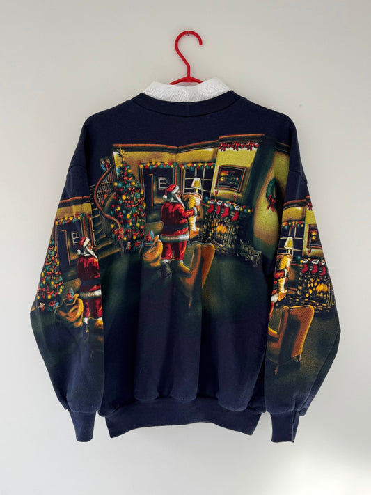90s vintage christmas holiday scene graphic pullover sweater – large | unisex crazy winter santa long sleeved collared sweatshirt
