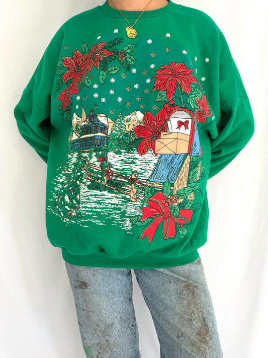 90s vintage green festive holiday scene pullover sweater – medium | Christmas winter snowy landscape outdoor graphic crewneck sweatshirt