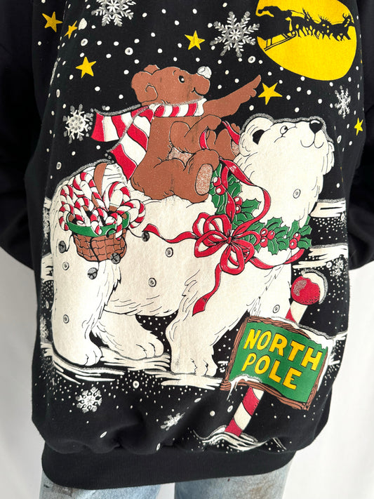 80s vintage black christmas scene teddy bear graphic pullover sweater – large | festive winter holiday santa snowy outdoor collared jumper