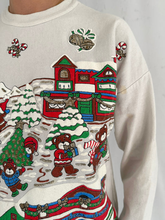 90s vintage colorful teddy bear christmas scene pullover sweater – medium | outdoor winter holiday graphic collared sweatshirt