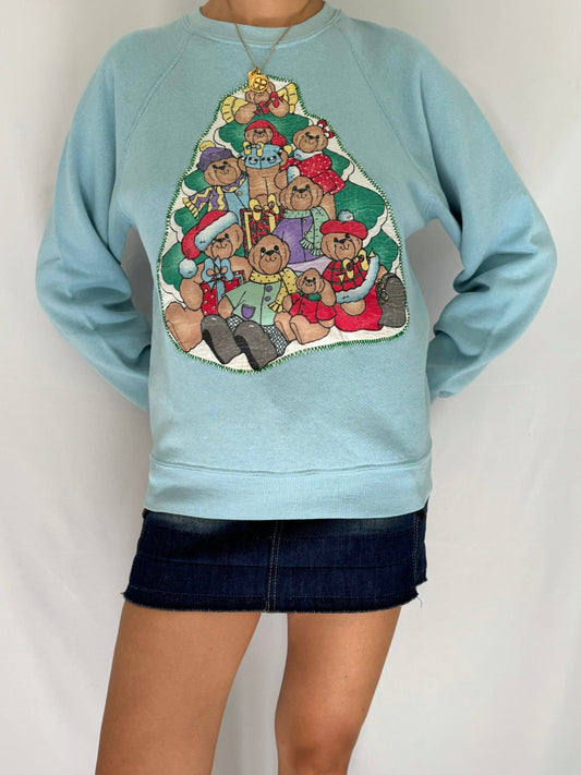 90s vintage blue colorful teddy bear christmas tree pullover sweater – small | festive winter holiday cute cartoon graphic raglan sweatshirt