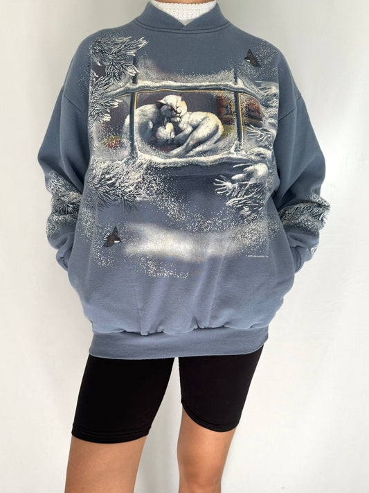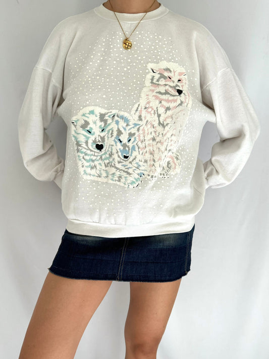90s vintage white snowy winter wolves graphic pullover sweater – small | pastel cute animal outdoor puffy cotton crewneck sweatshirt
