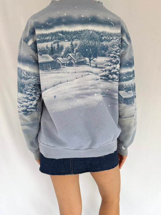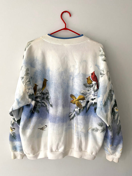 90s vintage blue snowy winter birds scene graphic pullover sweatshirt – medium | festive holiday outdoor snow distressed crewneck sweater