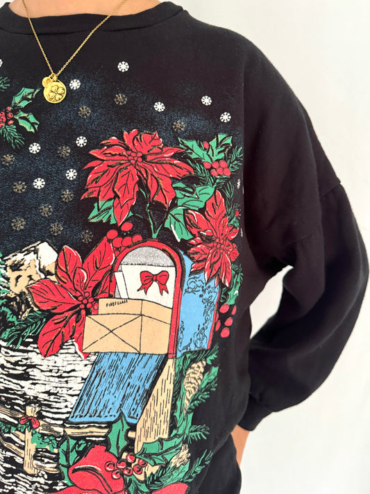 90s vintage black festive holiday scene pullover sweater – small | Christmas winter snowy landscape outdoor graphic crewneck sweatshirt
