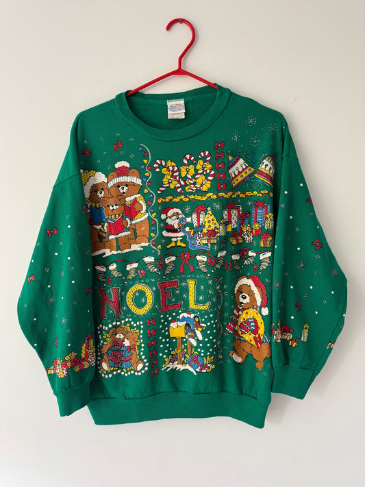80s vintage green christmas teddy bear graphic pullover sweater – large | festive winter holiday snowy outdoor crewneck jumper