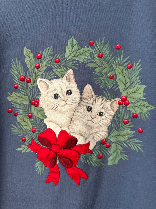 90s vintage blue winter holiday kittens graphic pullover sweatshirt – extra large | christmas wreath cats animal festive collared sweater