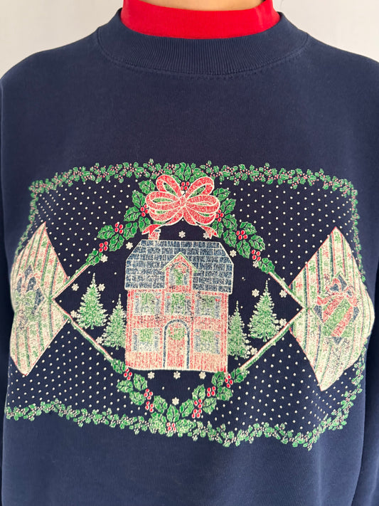 90s vintage navy blue winter holiday festive graphic pullover sweatshirt – medium, large | outdoor christmas scene cotton collared sweater