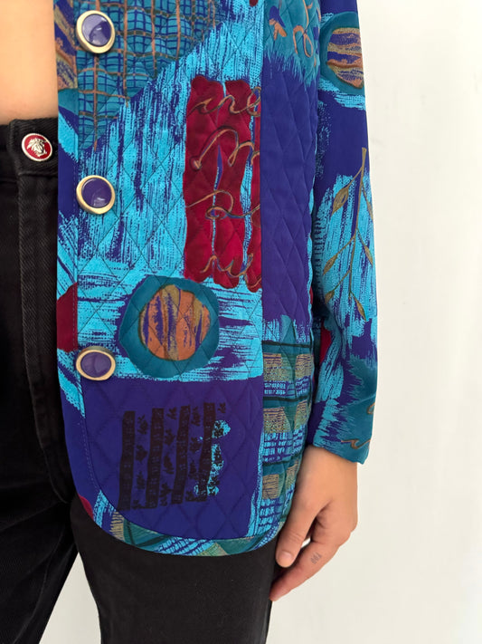 80s vintage blue abstract quilted button up jacket - medium, large | puffy light long sleeved blazer coat