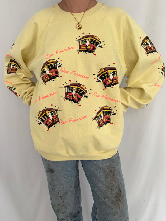 90s vintage yellow san francisco panda retro pullover sweatshirt – large | unisex california souvenir cotton crewneck sweater