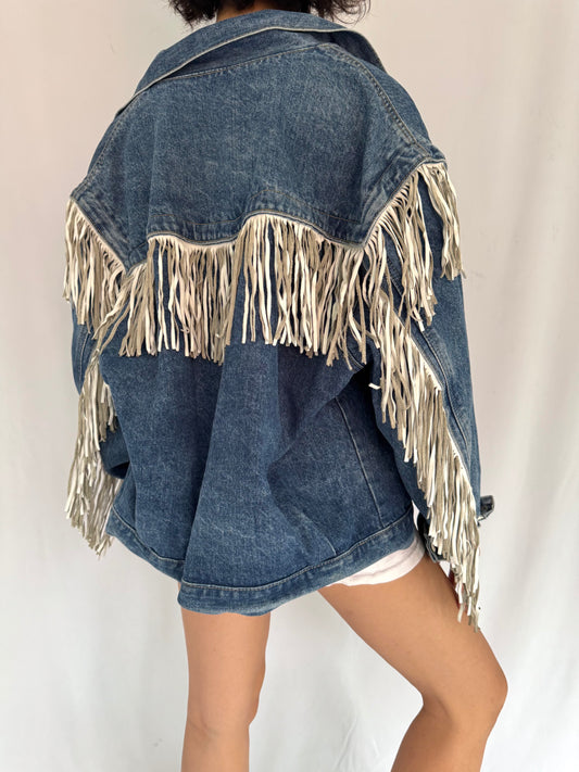 80s vintage blue denim leather fringed jean jacket – small, medium | retro western fringe casual funky festival long sleeved coat