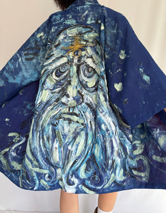 60s vintage blue hand painted Japanese haori – one size, unisex | made in japan unique art to wear open front kimono robe