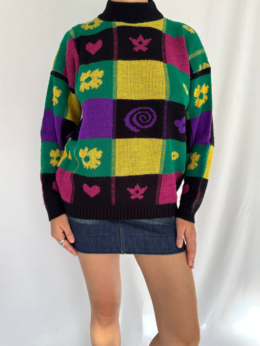 80s vintage multicolor funky abstract print knit sweater – medium | retro sparkly patterned long sleeved jumper