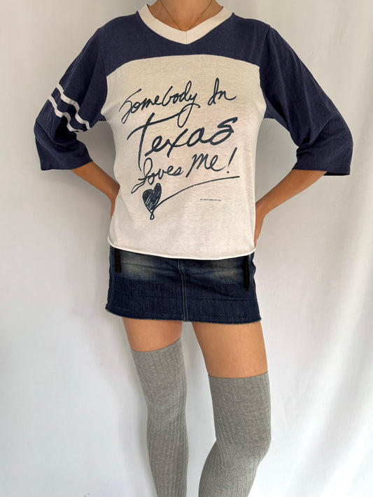 80s vintage navy white somebody in texas loves me baseball tee shirt – small, medium | graphic travel souvenir half sleeved top