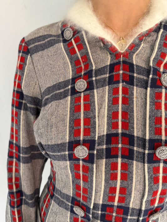 vintage handmade multicolor plaid blouse with angora trim collar – extra small | unique retro fitted mod twee folky top