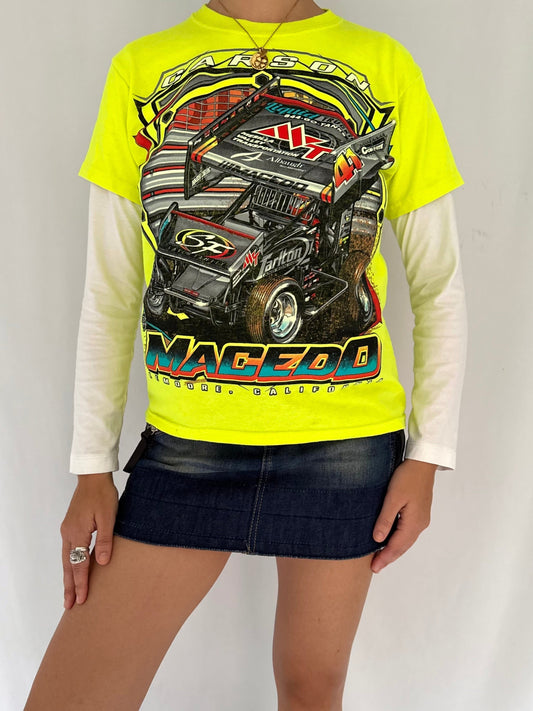 90s vintage yellow neon race car graphic tee shirt - small | bright hot rod nascar cotton short sleeved tshirt