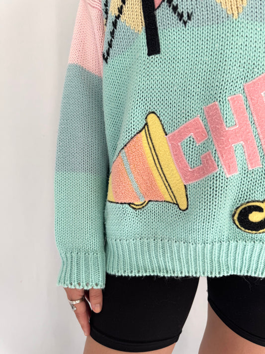 80s vintage pastel novelty cheerleader chunky knit sweater – medium | funky retro abstract slouchy acrylic pullover jumper