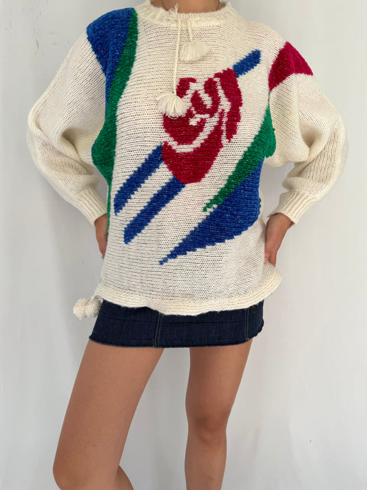 80s vintage floral rose abstract long sleeved knit sweater – medium | multicolor sparkly retro casual acrylic jumper