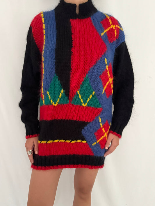 80s vintage multicolor abstract mohair turtleneck knit sweater – large | funky patterned novelty print long sleeved jumper