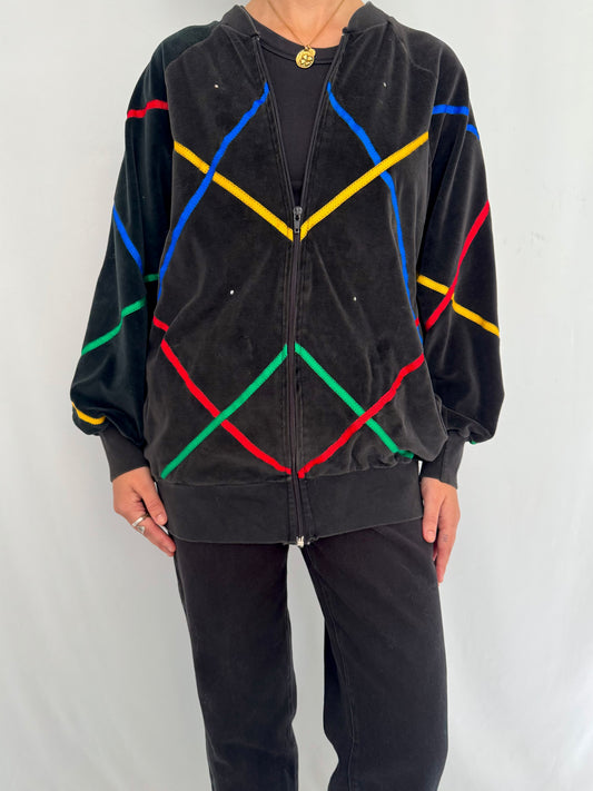 80s vintage black rainbow striped velour track jacket – small, medium | retro funky casual sporty abstract zip up sweatshirt