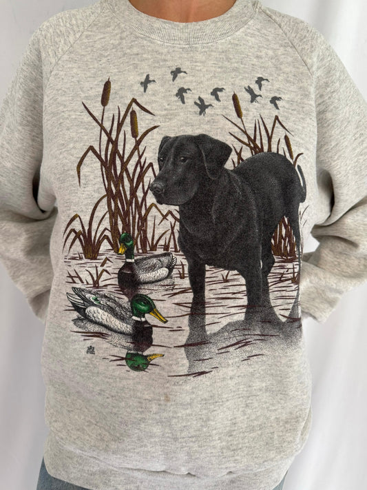 80s vintage grey animal black lab graphic pullover sweatshirt – large | unisex dog mallard duck long sleeved sweater