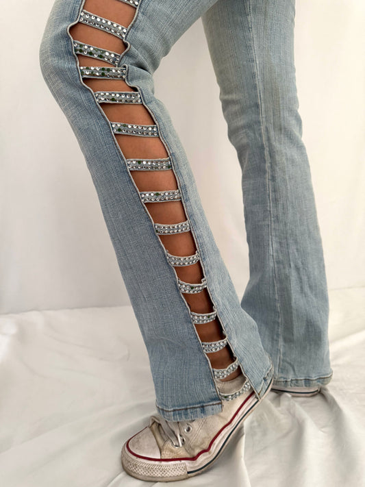 y2k vintage blue denim rhinestone cut outs jeans – small | embellished crystal studded open sides low waist slim pants