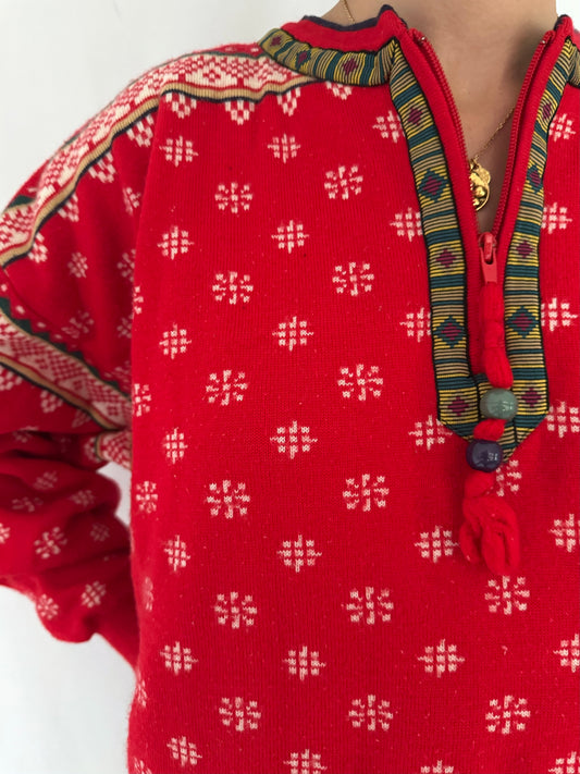 80s vintage red boho aztec quarter zip knit pullover sweater – large | hippy artsy folk beaded nordic long sleeved cardigan