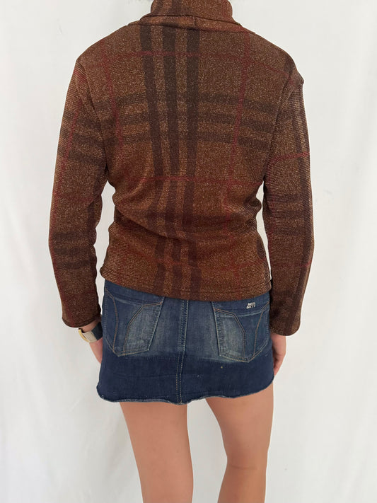 90s vintage brown metallic knit turtleneck sheer sweater blouse – small, medium | unique plaid shimmer funky collared top