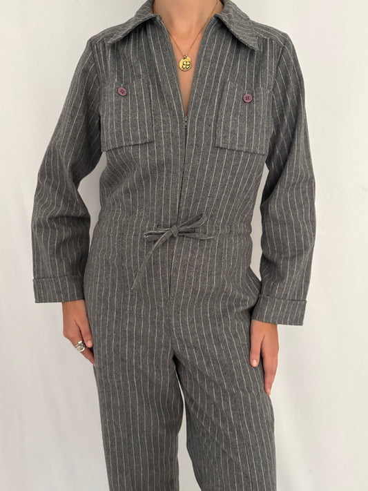 70s vintage grey pinstripe wool long sleeved pant jumpsuit – small, medium | tailored zip up collared one piece pantsuit