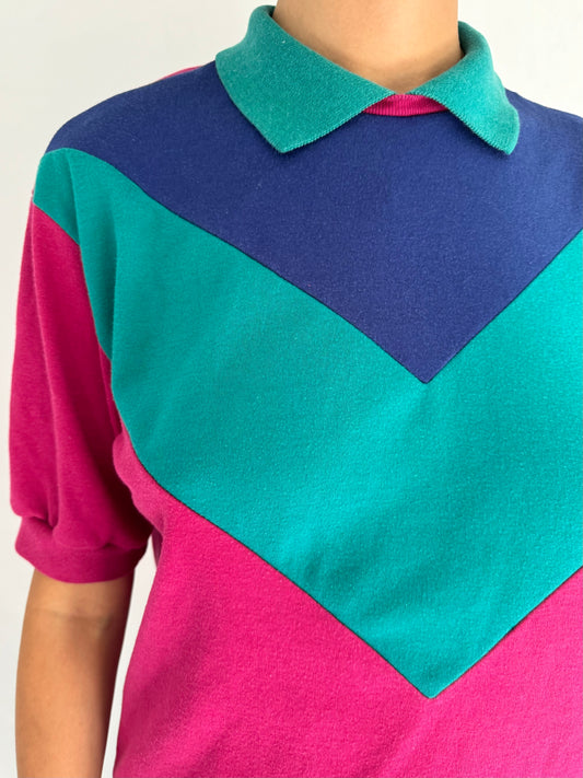 80s vintage multicolor geometric collared short sleeved shirt – small, medium | retro contrast colorblock casual polo