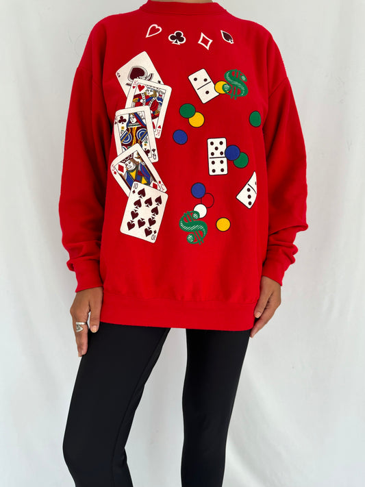 80s vintage red casino poker games night pullover sweater – medium | novelty print playing cards las vegas crewneck sweatshirt
