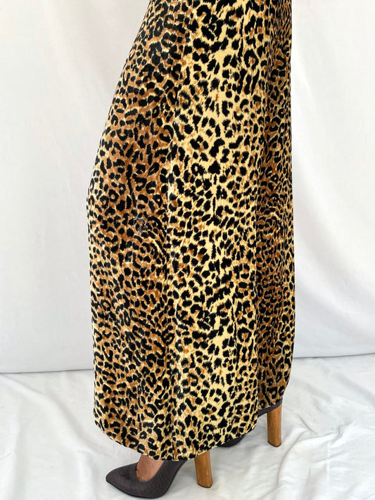 70s vintage leopard animal print velvet sleeveless pant jumpsuit – medium | disco party retro mod flared pantsuit